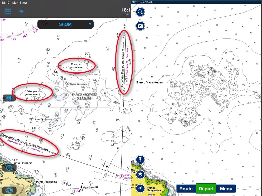 I come back to A Coruña with another example that, itself, directly concerns security. The opening of this deep bay is blocked by a long bank of rock shoals that can create breakers in strong winds from north to west. Below, only the SHOM map presents explicit information to warn the navigator who does not know the surroundings. See the slideshow :