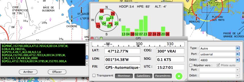 De toute manière, il faudra bien vérifier la réception des données dans le tiroir « Moniteur » du panneau GPS de GPSNavX/MacENC, les données du GPS apparaissant en vert, les autres données en jaune.