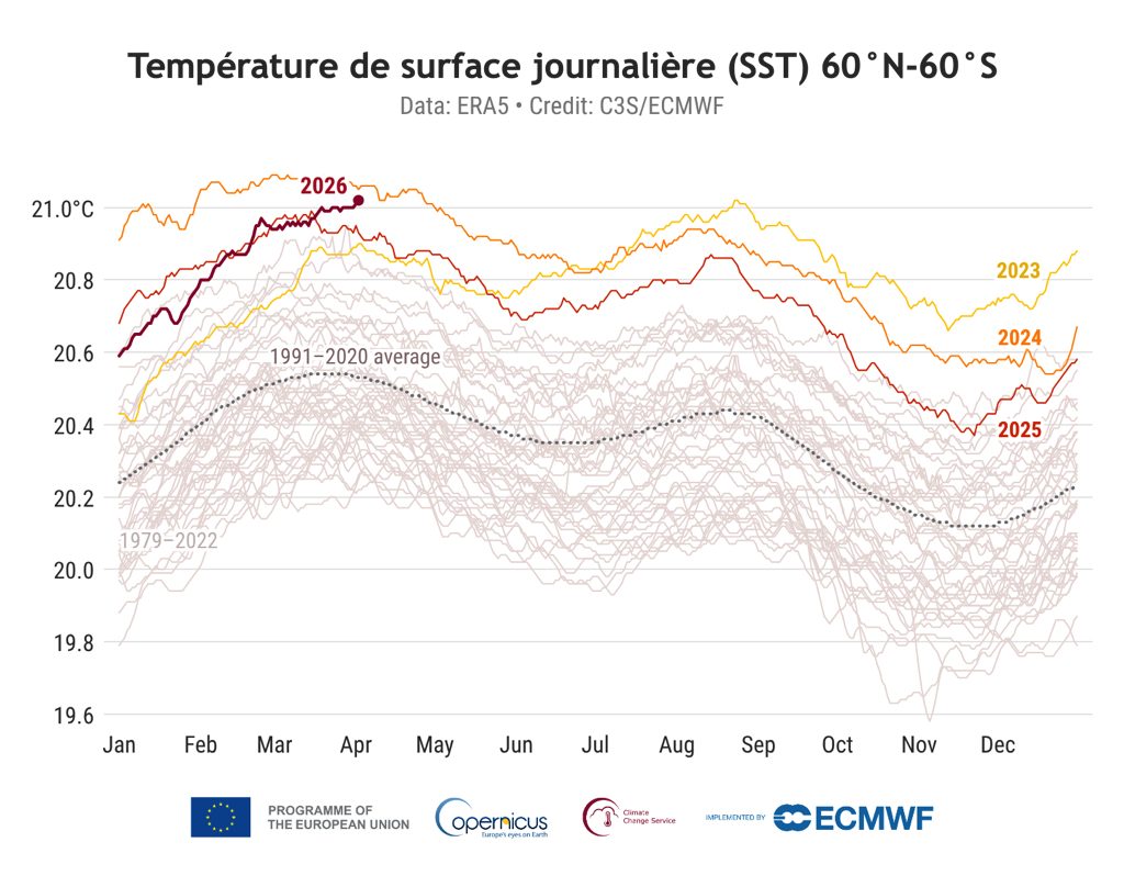 Au Climate Change Service (C3S) de la division Copernicus du Centre Européen de Prévisions Météorologique à Moyen-Terme, le ton est plus alarmiste. Le mois de mars 2026 a enregistré la deuxième température de surface de la mer (SST) la plus élevée jamais observée, derrière mars 2025, reflétant une transition probable vers des conditions El Niño, comme le rapporte leur dernier bulletin climatique. Des conditions El Niño fortes ou très fortes pourraient contribuer à une nouvelle année record, les eaux de surface plus chaudes du Pacifique équatorial libérant davantage de chaleur dans l’atmosphère.