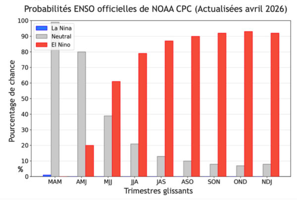 Dans son rapport du 27 avril, le CPC observe des conditions actuelles ENSO neutres. Les températures équatoriales de surface de la mer (SST) sont proches ou supérieures à la moyenne dans le centre-est de l’océan Pacifique. Ces conditions ENSO neutres sont attendues d’avril à juin 2026 (probabilité de 80 %). En mai-juillet 2026, El Niño devrait se manifester (probabilité de 61 %) et persister au moins jusqu’à la fin de l’année 2026.