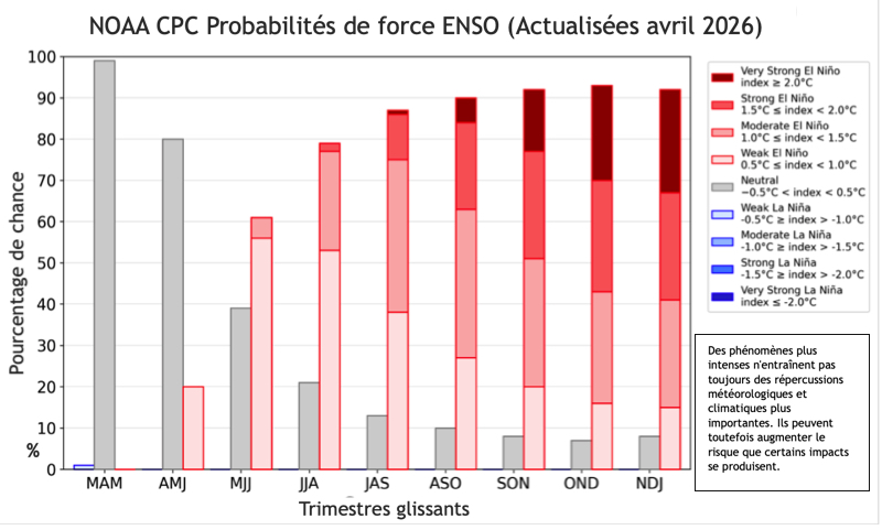 Les prévisions du CPC concernant l’intensité probable de l’ENSO, mises à jour le 9 avril 2026, sont mesurées : entre novembre 2026 et janvier 2027, les chances qu’un phénomène El Niño d’intensité très forte, forte ou modérée, se produise sont pratiquement équivalentes (25 %).