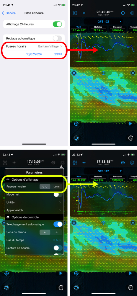 The solution is, without changing the settings of your devices, to switch the time of your application — Weather4D in this case — in UTC which immediately solves the problem.