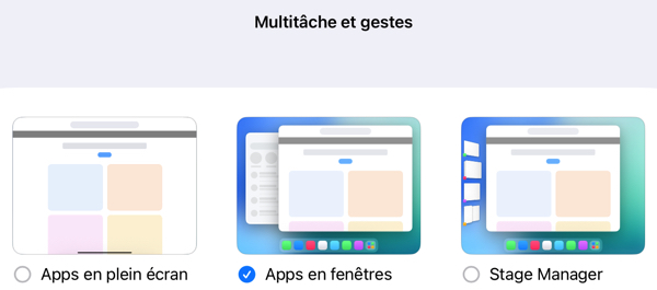 Dans les Réglages de iPadOS 26, il faut sélectionner, dans « Multitâche et gestes » le mode « Apps en fenêtres » :
