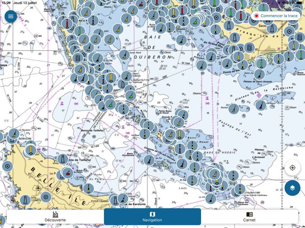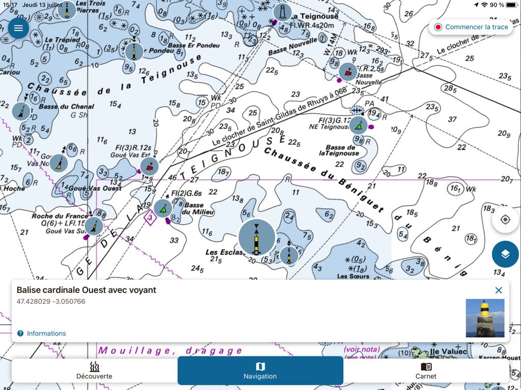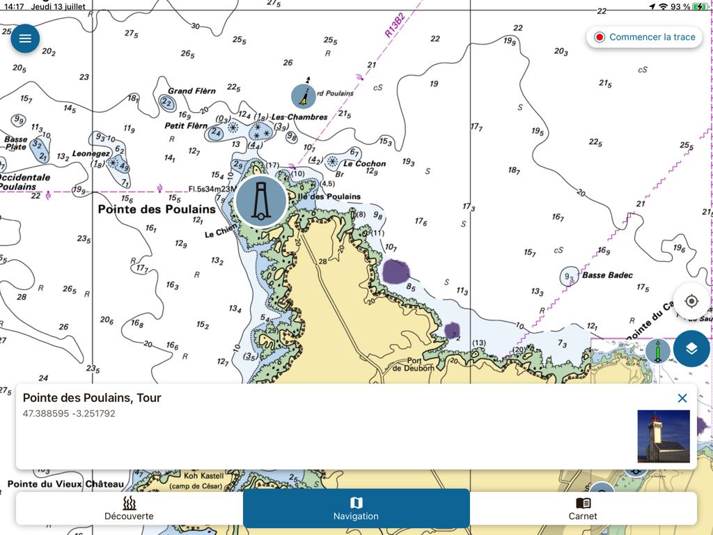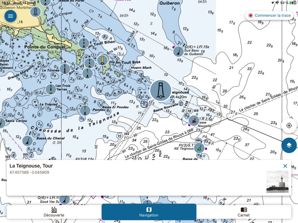 By selecting the tab Navigation, The choice of data to display is limited to beacons, marine protected areas, environmental regulations and sensitive anchorages. Beacons are represented as realistic color thumbnails overlayed on the SHOM base chart. A tap on one of them opens a description window including a color photo of the beacon : buoy, tower, lighthouse or landmark.
