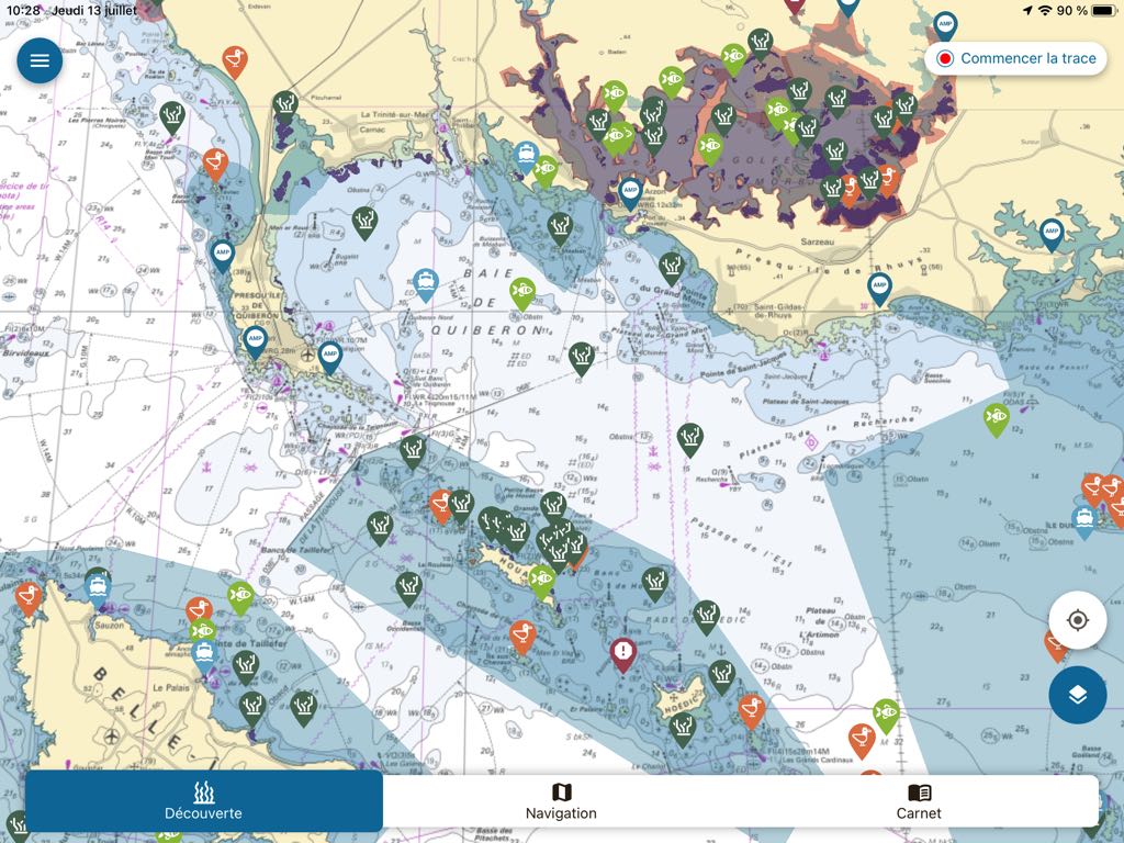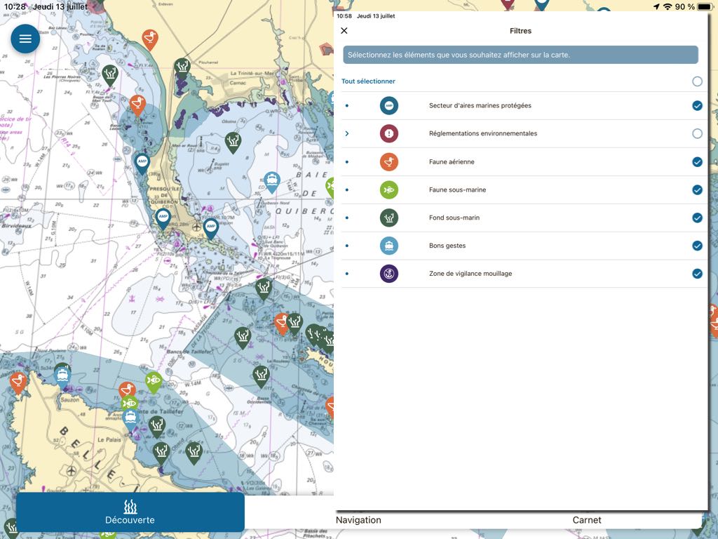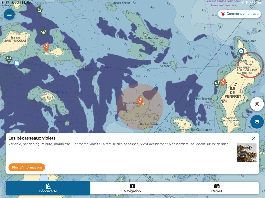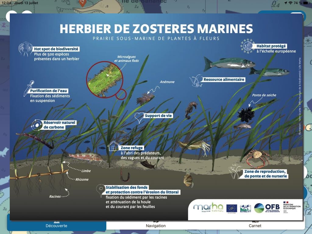 As DONIA, Nav&Co aims to raise awareness among boaters about the protection of the marine environment, providing detailed information on marine protected areas, wildlife, the flora and the seabed, and also by displaying vigilance zones for anchorages. The application offers two display modes on an exclusive background of SHOM nautical charts : The " Discover " and the " Navigation ”.