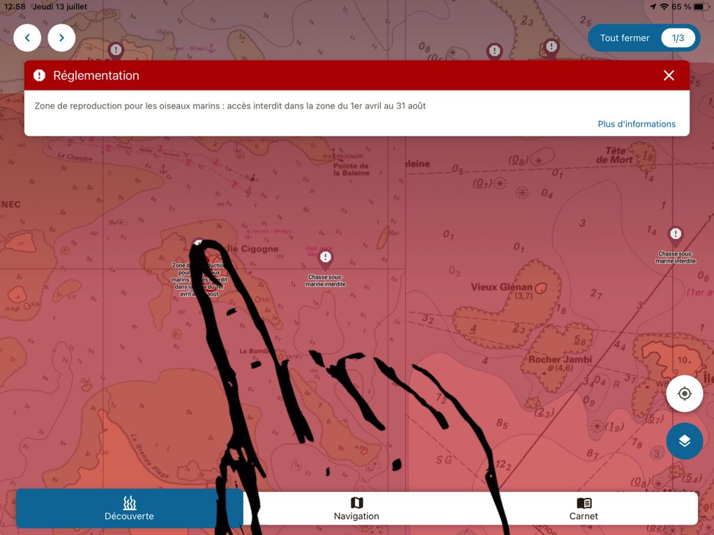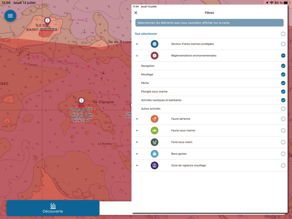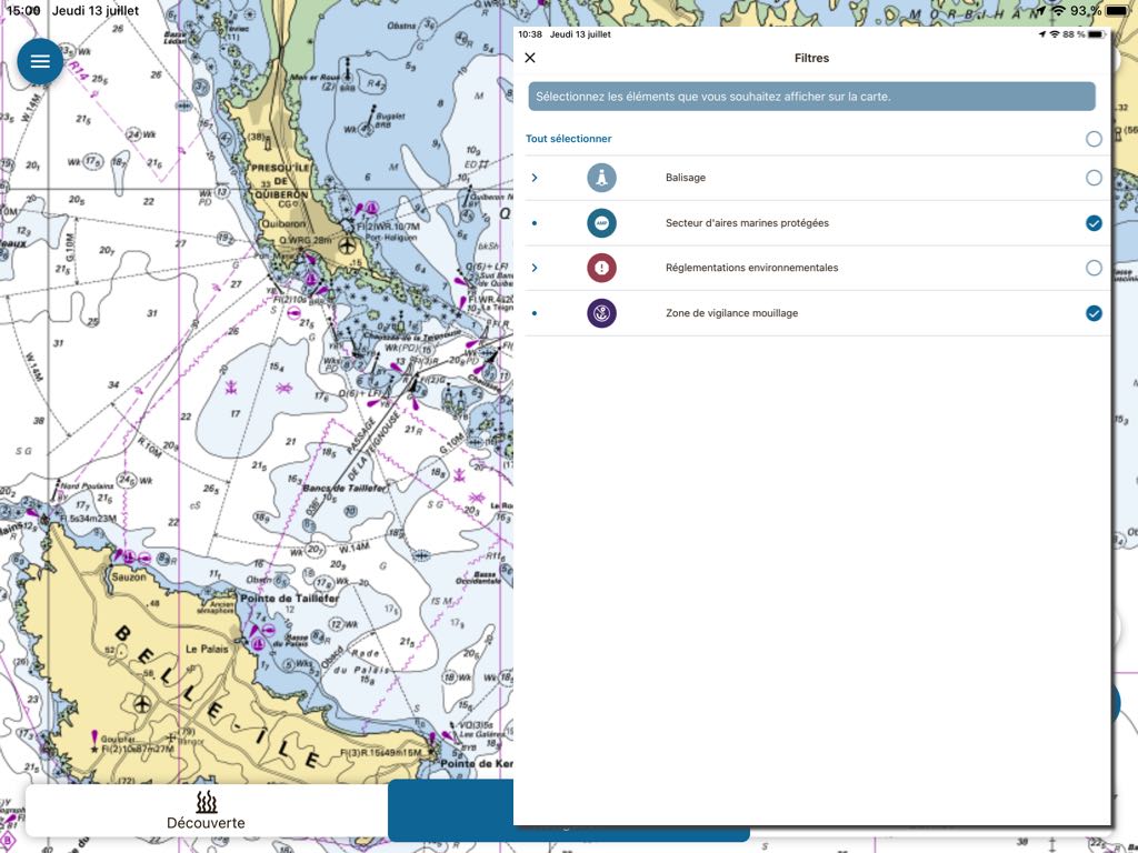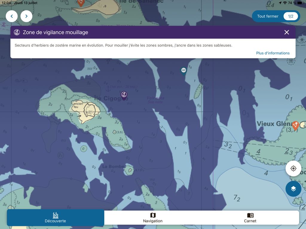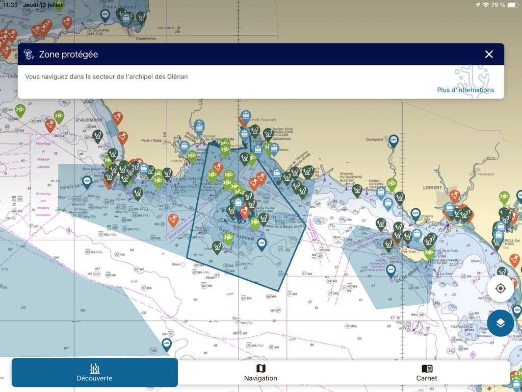 Marine protected areas and vigilance zones for anchorages are identified by specific colours. A tap on one of these areas also opens up contextual information :