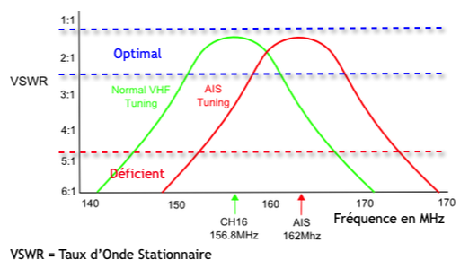 In addition, antennas dedicated to AIS frequencies provide maximum gain (VSWR) to 162 MHz, corresponding to the middle of the AIS frequency range, while the maximum gain of a VHF antenna is at the frequency of 157 MHz (²).