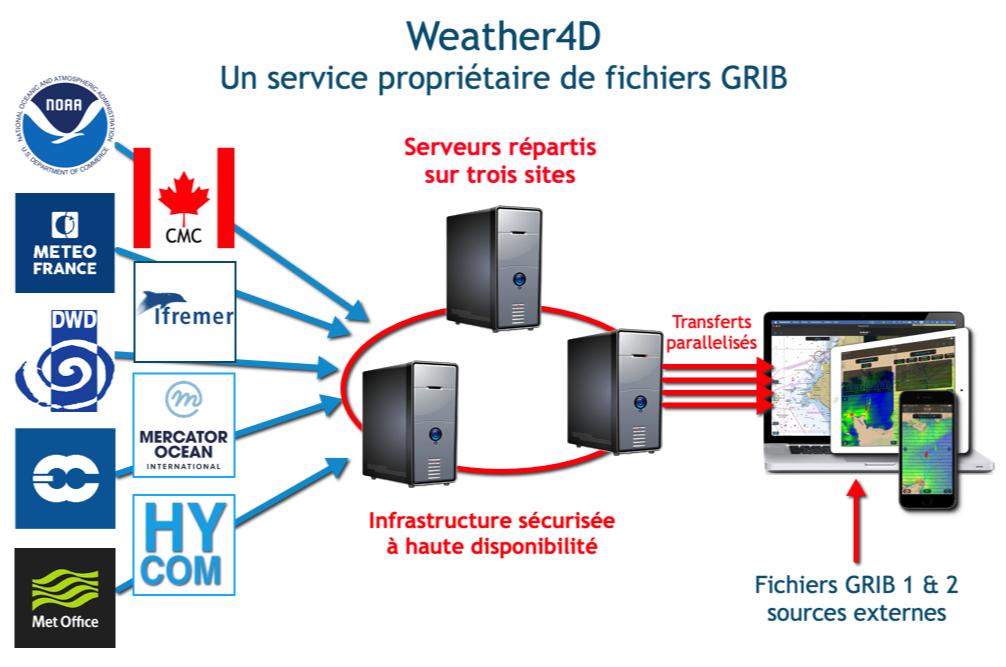 Une nouvelle infrastructure de serveurs est mise en œuvre, en partenariat avec SailGrib, pour accompagner ce changement. Ils sont calibrés en vue d’un accroissement sensible des téléchargements, de l’augmentation des résolutions, et de l’intégration des fichiers de courants à très hautes résolutions. Ces serveurs à haute disponibilité sont répartis sur trois sites, un processus de basculement automatique garantissant la continuité du service. Des procédures améliorées de téléchargement et de contrôle des fichiers en entrée devraient viabiliser la qualité des GRIB en sortie, avec de surcroît des taux de compression pouvant atteindre jusqu’à 80%. Une bonne nouvelle pour les utilisateurs disposant d’un faible débit, et une vraie aubaine pour les utilisateurs d’un Iridium GO!®.